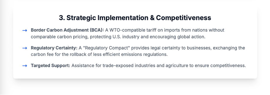 By integrating a fiscal bargain, an automatic climate trigger, a smart sunset for subsidies, and a performance-based corporate compact, we feel our framework represents a uniquely pragmatic attempt to solve the Carbon Pricing Trilemma. Its design is a kind of “statutory fortress,” with its core functions embedded in law to be resilient to political and legal challenges. This approach acknowledges that in today’s environment, the technical elegance of a policy is less important than its ability to build and sustain a durable coalition.