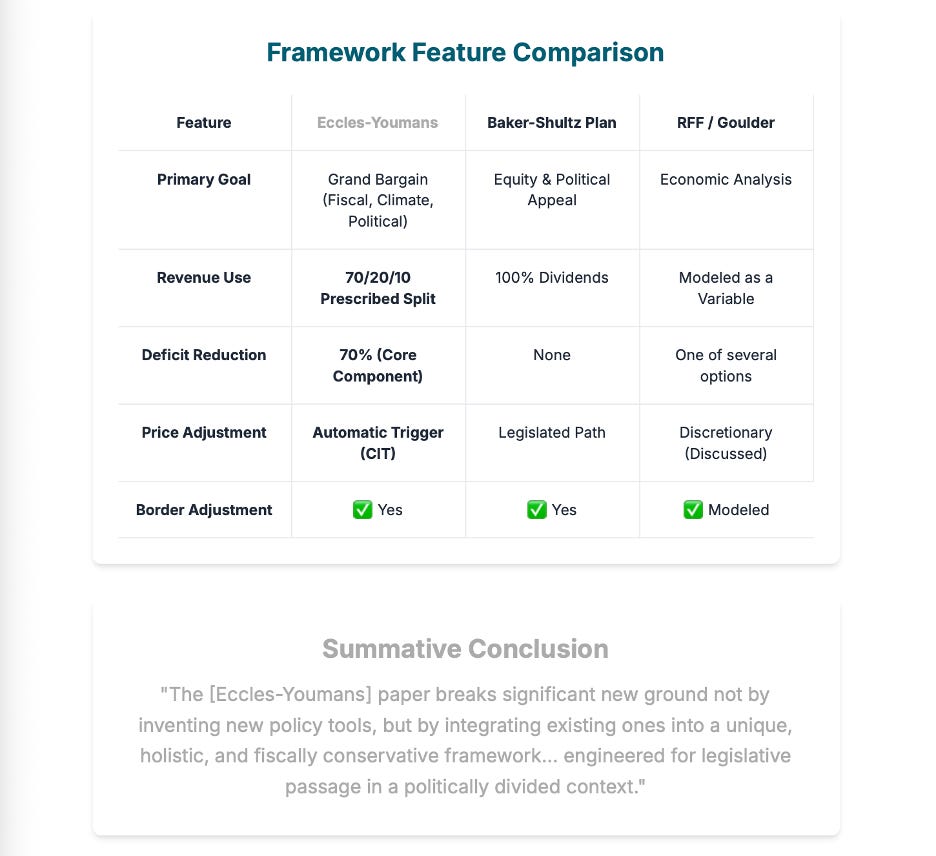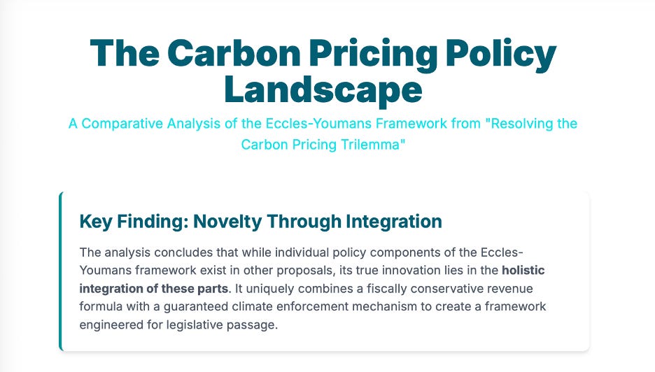 We think our Resolving the Carbon Pricing Trilemma paper breaks significant new ground not by inventing new policy tools, but by integrating existing ones into a unique, holistic, and fiscally conservative framework, engineered for legislative passage in a politically divided context.