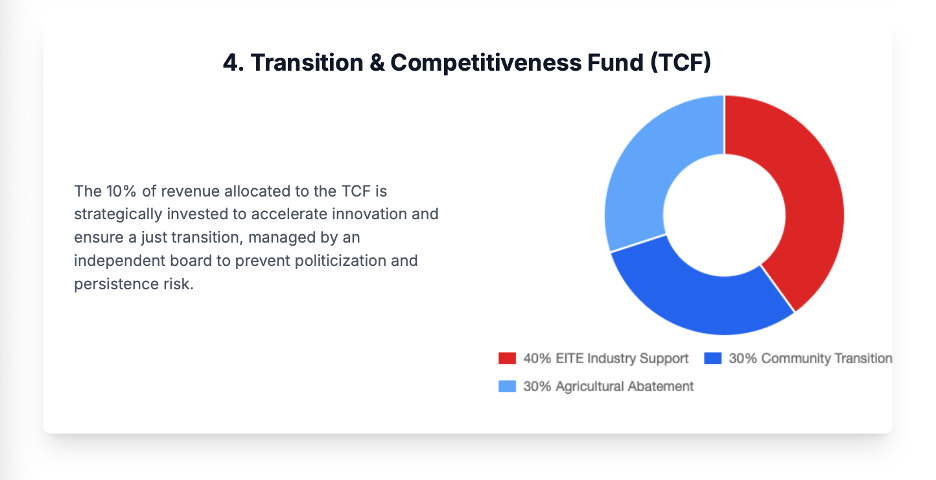 Government support programs often suffer from “persistence risk”—the tendency to become permanent political fixtures. The framework’s Transition & Competitiveness Fund avoids this trap with an innovative, performance-based sunset mechanism.