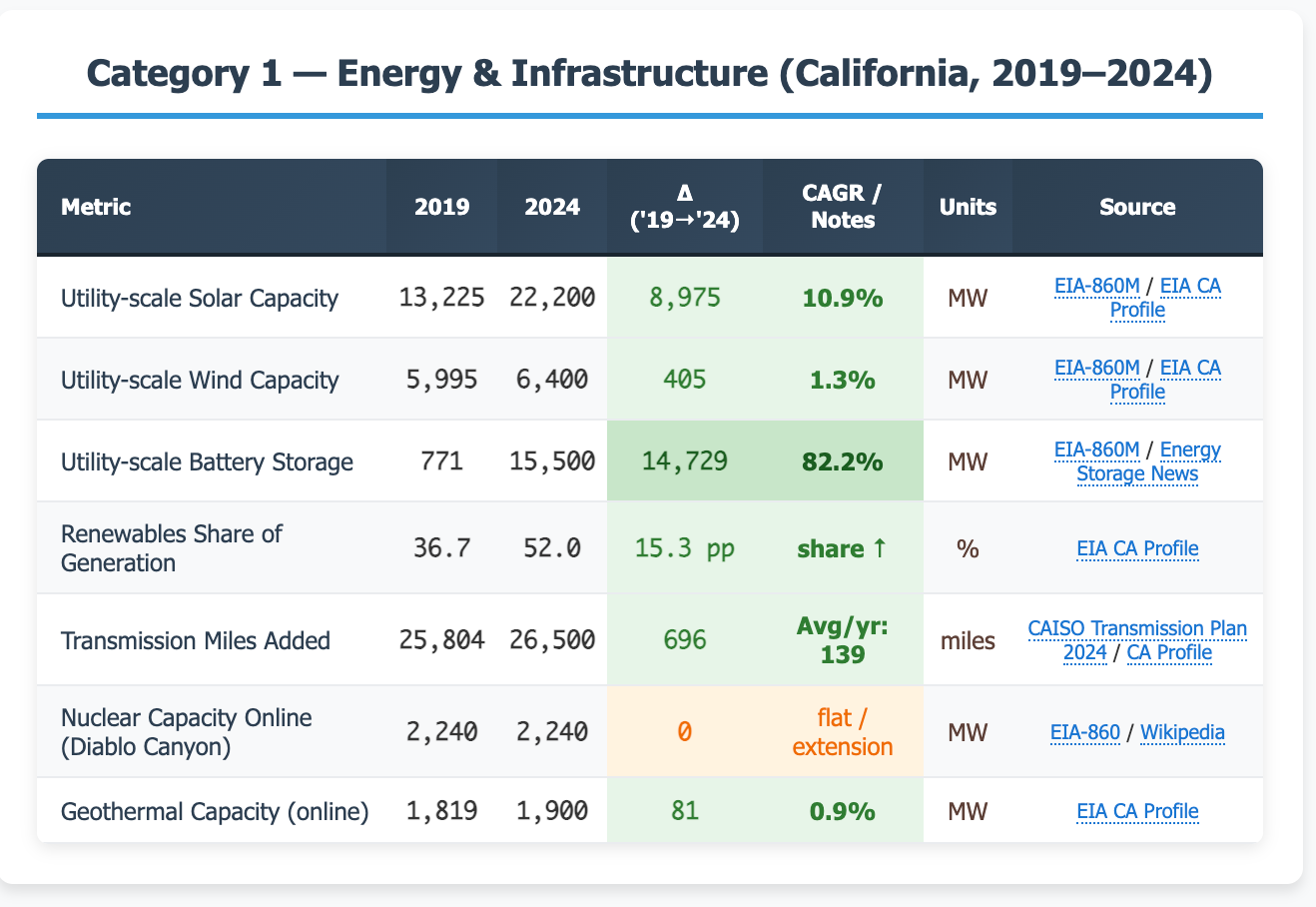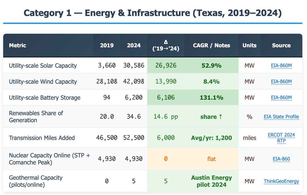 Even more striking, Texas now generates 34.6% of its electricity from renewable sources, up from just 20% in 2019. This 14.6 percentage point increase nearly matches California's gain of 15.3 percentage points, achieved despite California's decades-long head start and aggressive renewable mandates. It is economics, not policy mandates, that is driving renewable energy growth in Texas.