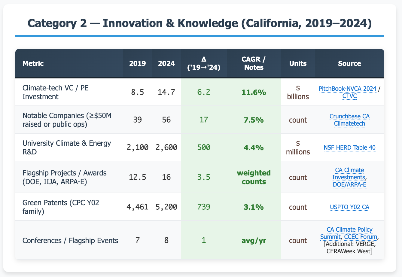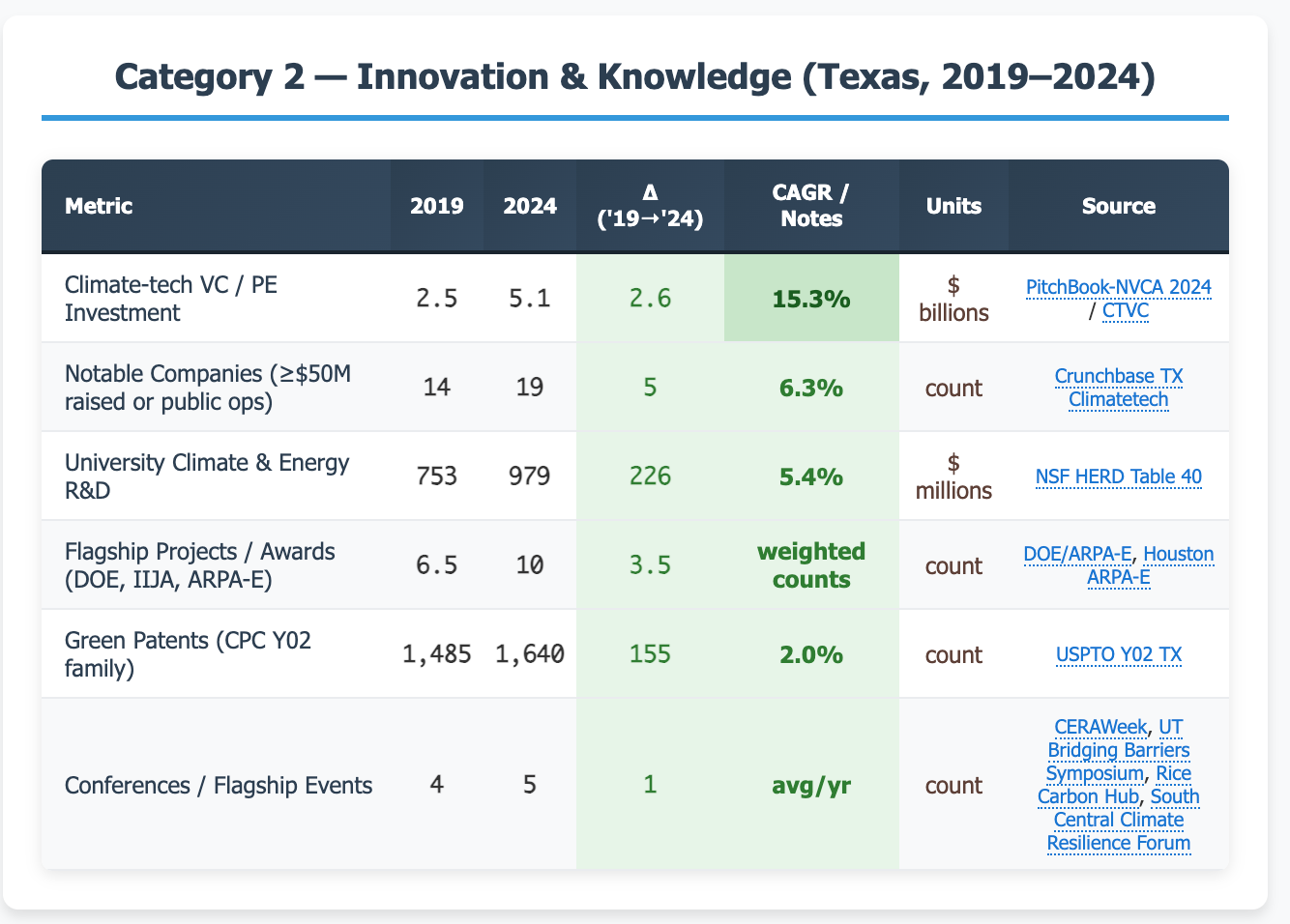 These metrics reveal Texas developing a competitive innovation cluster around practical energy technologies (e.g., carbon capture and storage, enhanced oil recovery, grid modernization, and energy storage) that align with the state's existing industrial base while advancing climate goals.