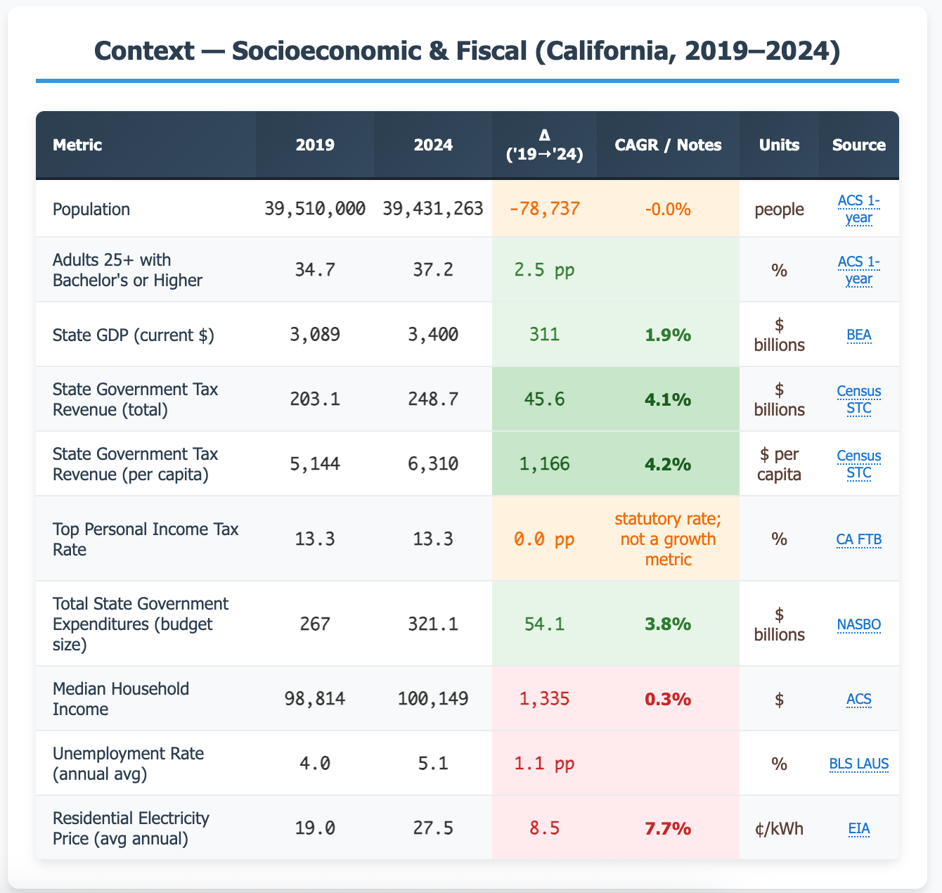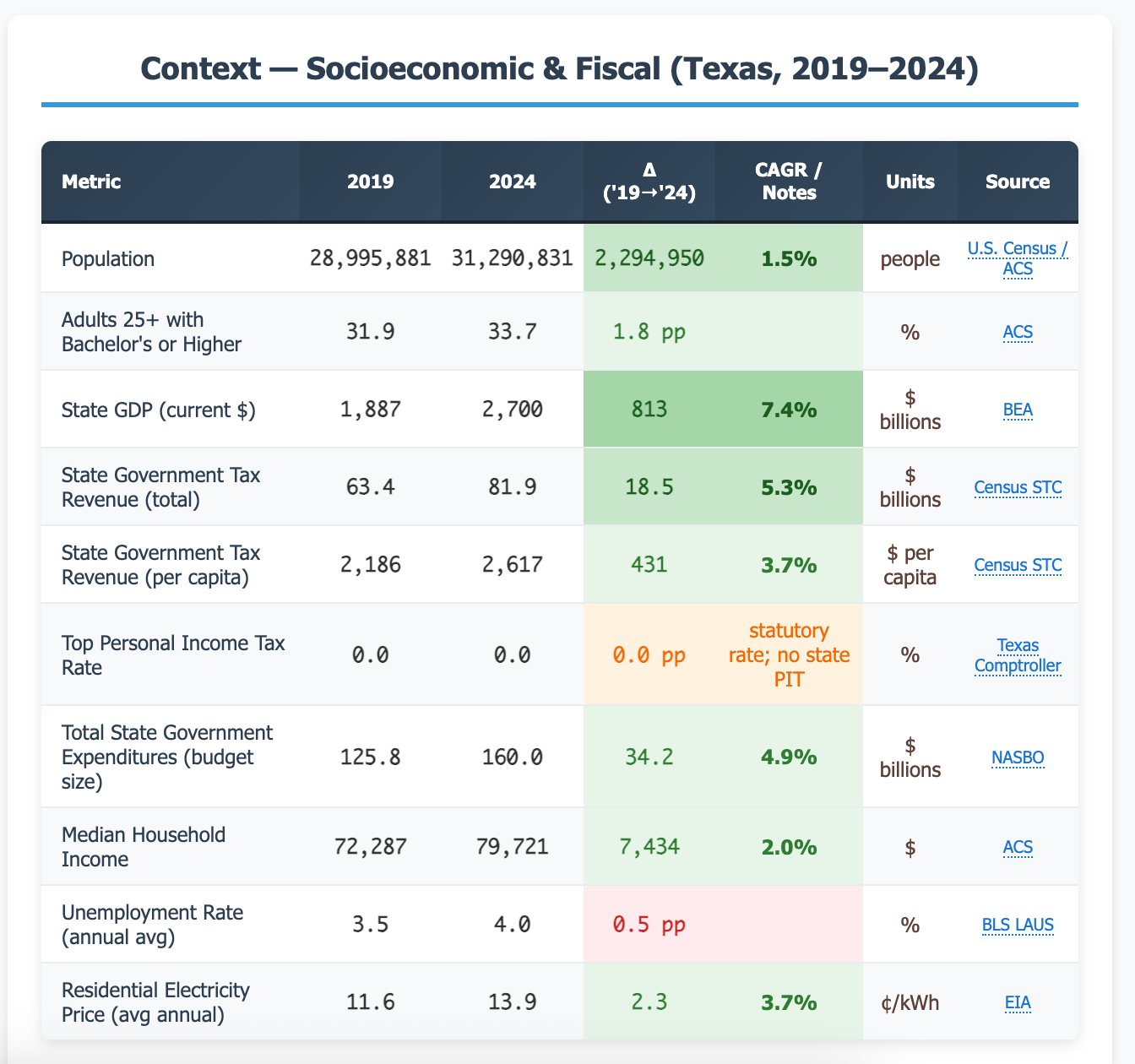 Median household income in Texas grew by $7,434 over five years, compared to California's anemic $1,335 increase. Texas maintained significantly lower electricity costs—13.9 cents per kWh versus California's 27.5 cents—while keeping unemployment lower despite the economic disruptions of this period.