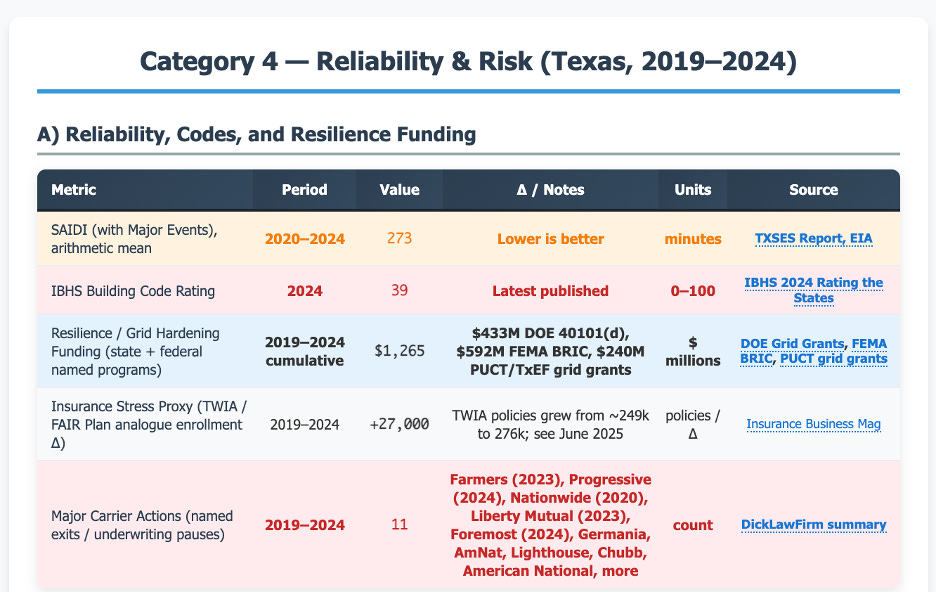 Yet Texas is responding with substantial investments. The state attracted $1.265 billion in grid reliability and resilience funding from 2019-2024, nearly matching California's $1.33 billion despite having no comprehensive climate policies. Virtually all of the California money comes from the Federal government through DOE Grid Resilience grants ($600 million), DOE 40101(d) ($67.5 million), and FEMA Building Resilient Infrastructure and Communities (BRIC) award ($662.5 billion). But 81% of the Texas money is from the Federal government as well.: DOE 40101(d) grants worth $493 million and FEMA BRIC awards worth $592 million. The rest ($240 million) is coming from Public Utility Commission of Texas (PUCT) grid hardening programs. So even very market-oriented Texas demonstrates the important role of government funding.