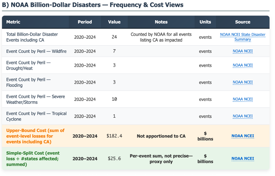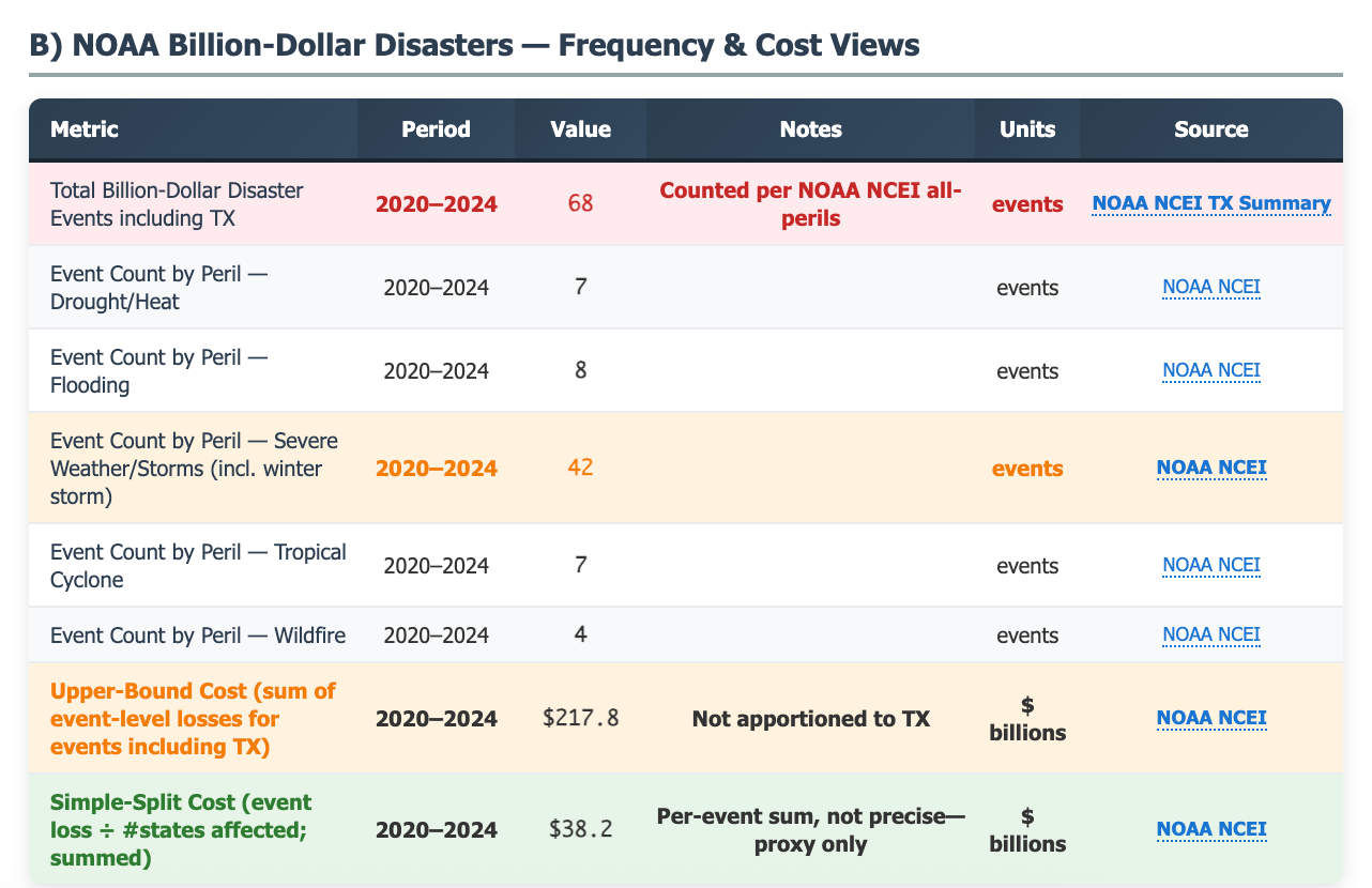 The disaster data is particularly telling. Texas experienced 68 billion-dollar disasters during 2020-2024, nearly three times California's 24 events. Severe weather dominates Texas's disaster profile with 42 events, compared to California's wildfire-heavy pattern of just seven wildfire events among its disasters.